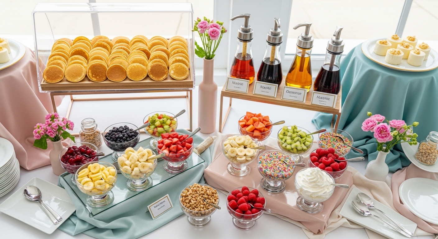 Warm, bite-size pancakes served with a fully customizable toppings bar where guests choose from syrups, fruits, candies, sprinkles, and whipped cream.
