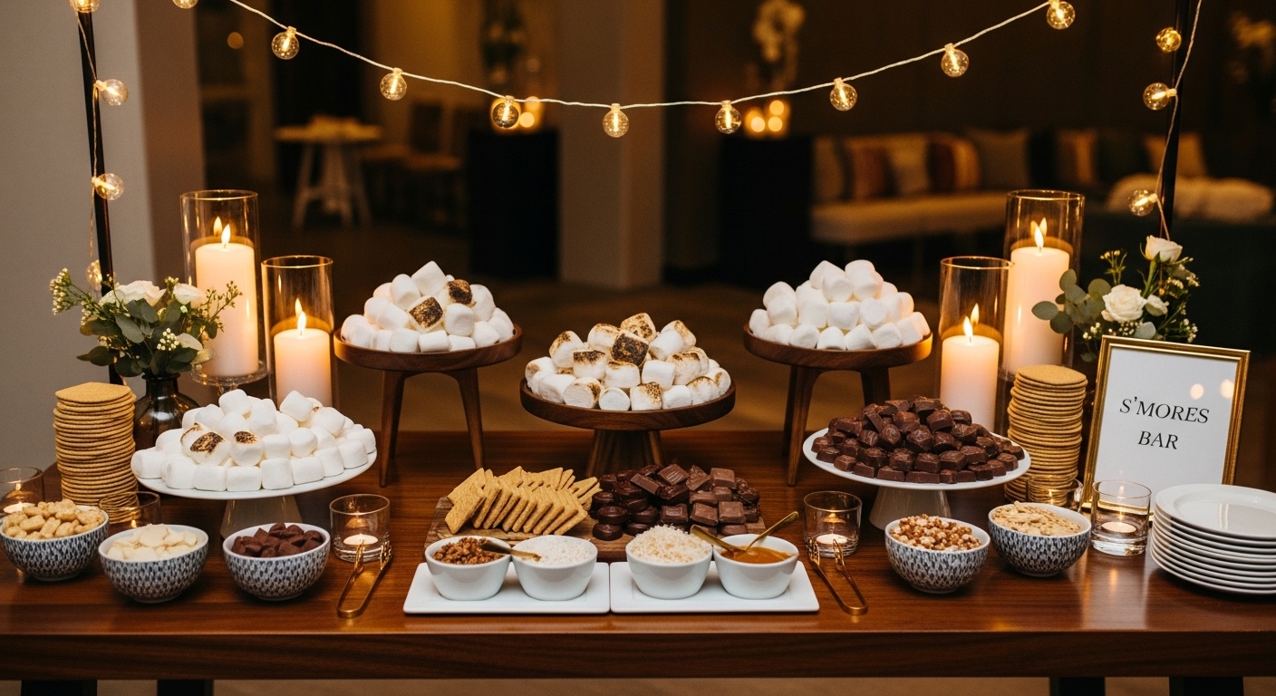 A DIY s’mores station where guests roast marshmallows and build their perfect combo of chocolate, graham crackers, and sweet extras.