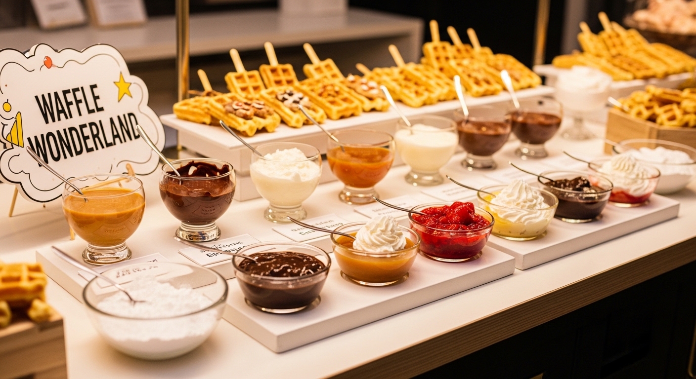 Fresh waffle sticks with a build-your-own topping station featuring sauces, fruit, powdered sugar, and sweet drizzles guests can mix and match.