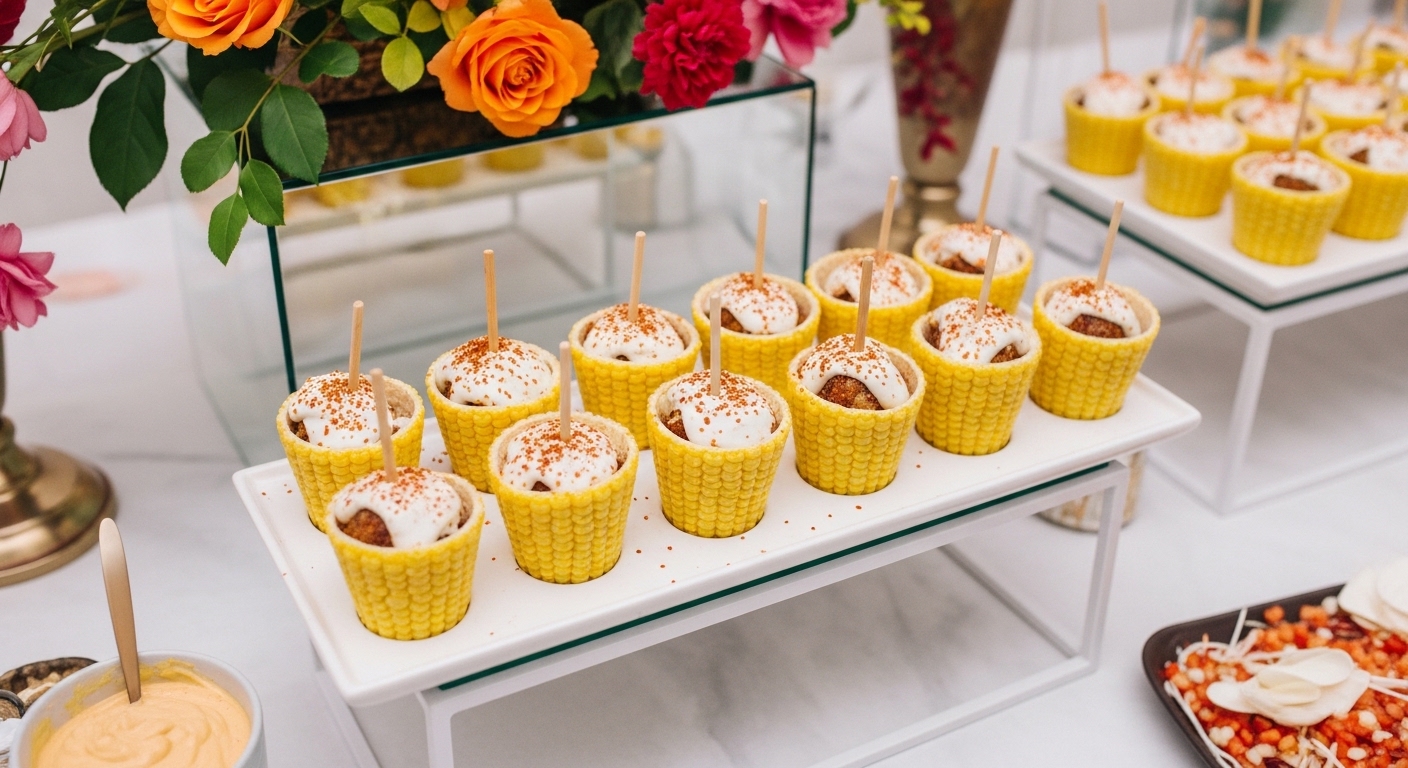 Elote cups topped to order with creamy sauces, cheese, chili-lime seasoning, and flavorful add-ons.