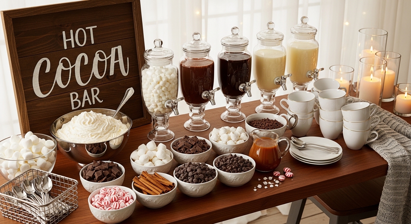 A cozy hot cocoa bar with customizable toppings like marshmallows, whipped cream, chocolate, and festive sweet extras.