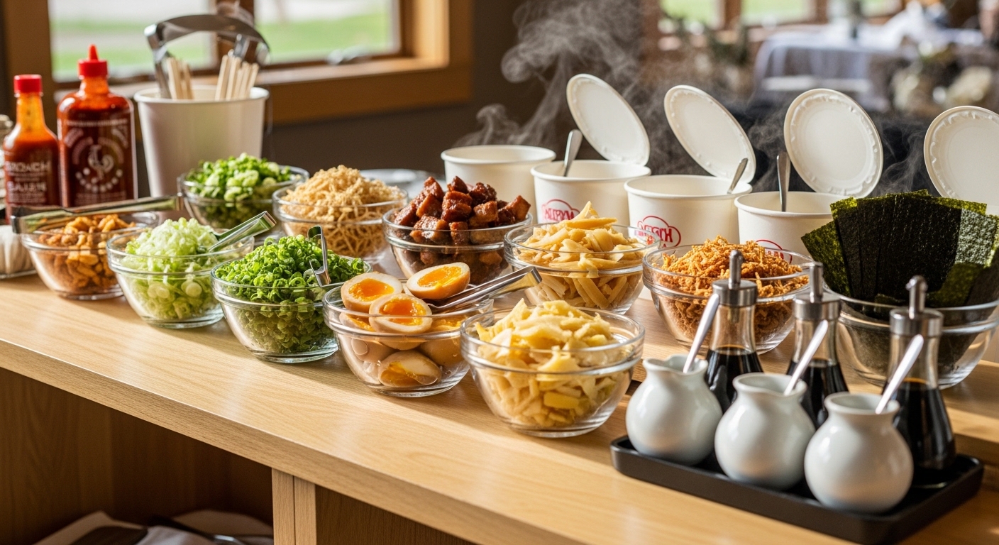 A cozy build-your-own cup noodle experience with savory broths, toppings, sauces, and crunchy add-ins guests can customize to their taste.