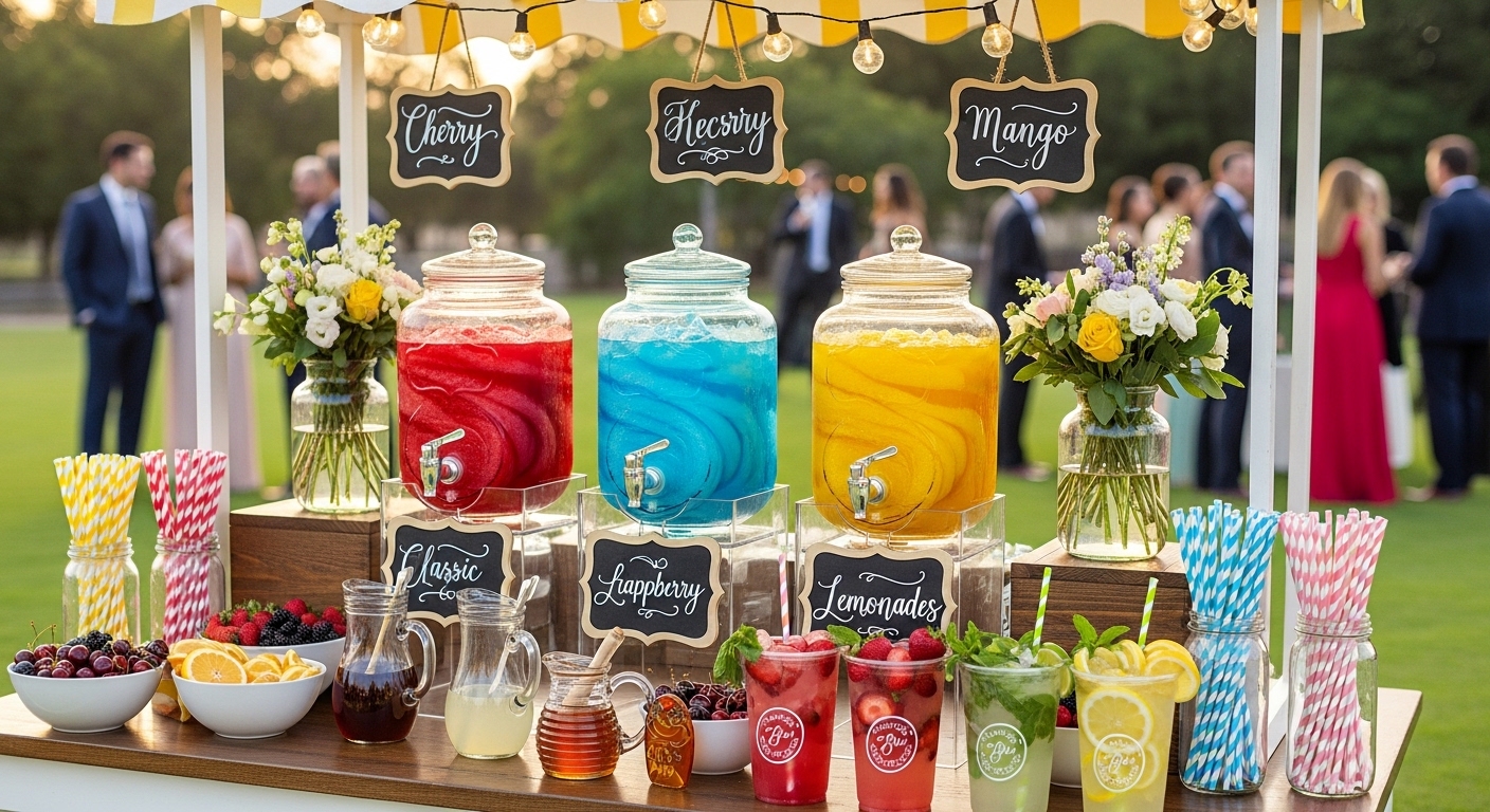 A refreshing drink station where guests mix and match fruity slushies and lemonades with fun flavors, candies, and sweet add-ins.