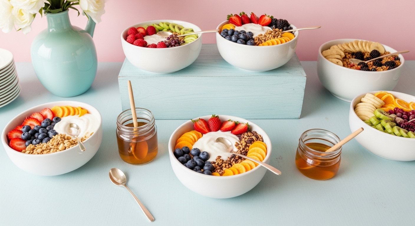 Yogurt and açaí bowls with a customizable topping spread of granola, fruit, honey, coconut, and crunchy add-ons.
